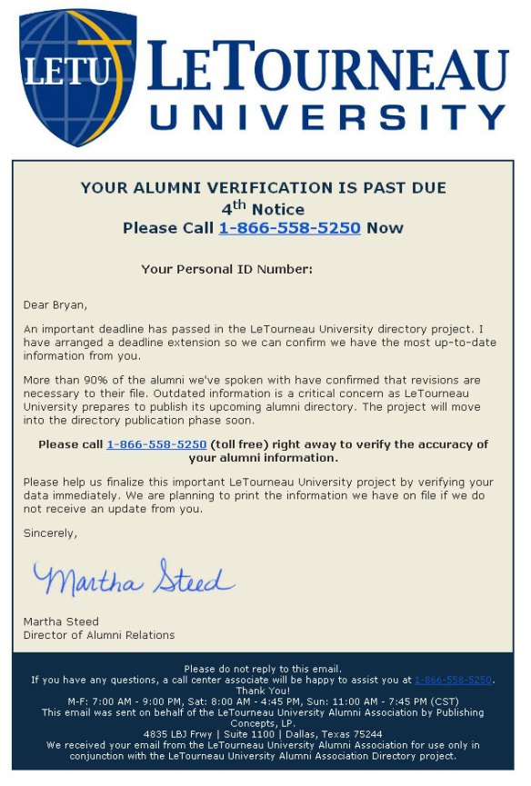 Almost six years later, I find myself gainfully employed and slowly paying back my student debt. Over the past few months, I have been receiving emails/mailers from a company LeTourneau has contracted to update their alumni directory. I do not wish to participate in this update. Instead of offering me a chance to opt out, I have been bombarded with emails and mailers warning me of being “past due” and the dreaded “4th notice”. This collections agency language and behavior is not befitting of the memories I have of the university. I really think that LeTourneau is capable of holding itself to a higher standard.