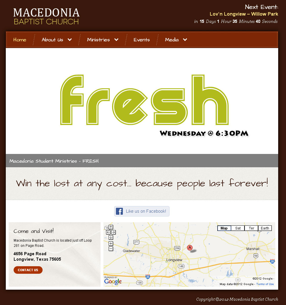 Below is a snapshot of site as it stands today. I still need to meet with the church once again to discuss some technical issues associated with going the self-hosted route (email, etc.). But otherwise the site is ready to go.