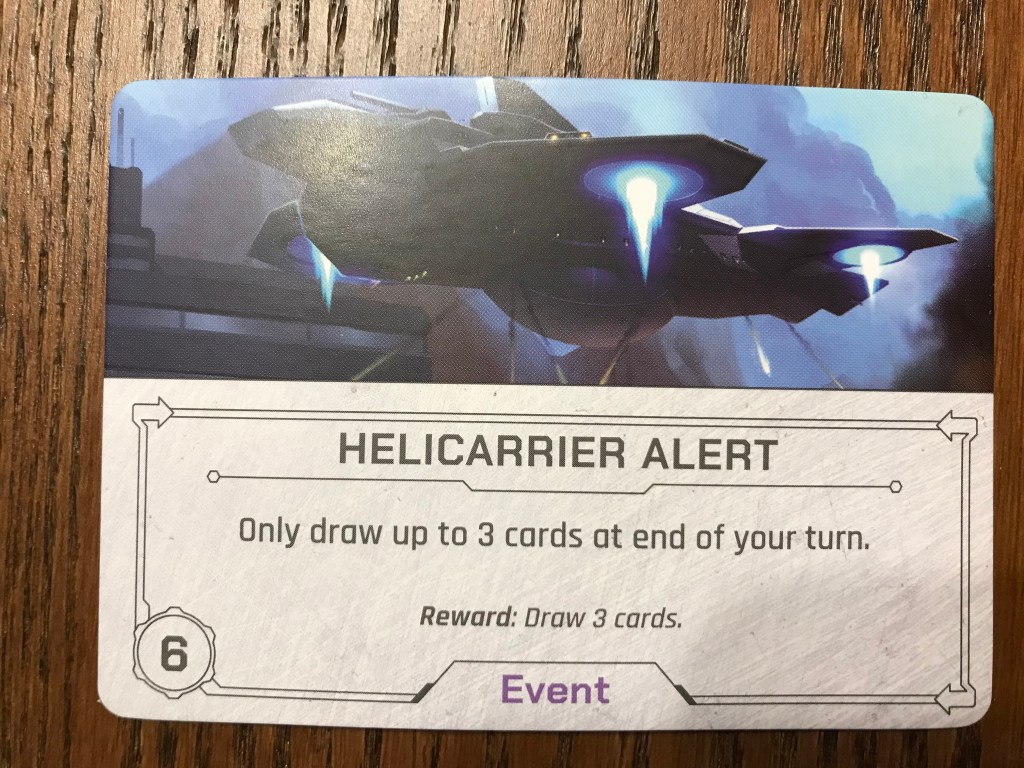 When a player draws an Event Card, the game is impacted until that event is dealt with. For “Helicarrier Alert”, you can only draw up to 3 cards at the end of your turn until players have sent enough Allies to deal with the 6 points of damage.