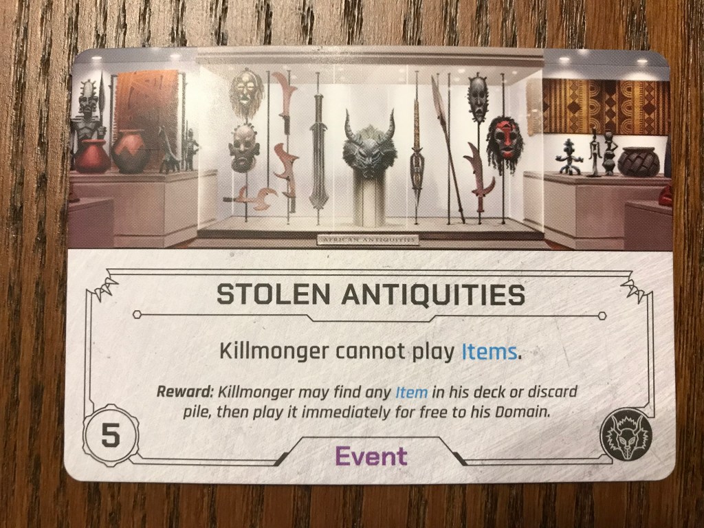 For the Event Card “Stolen Antiquities”, this card only directly impacts Killmonger. However, all the the players are free to Relocate Allies until the card is vanquished.
